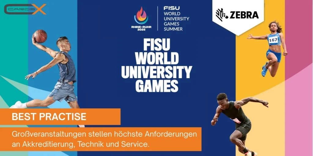 Wie sich diese Herausforderungen in der Praxis erfolgreich meistern lassen, zeigen wir in unserer neuen Best Practice zu den FISU World University Games Rhine-Ruhr 2025. Als offizieller Friends of the Games-Partner durfte cards-x die Akkreditierungslösungen für eines der größten Multisport-Events der Welt umsetzen. Im Mittelpunkt: der Zebra ZC10L Großformat-Kartendrucker in Kombination mit unserem Projekt- und Vor-Ort-Service.